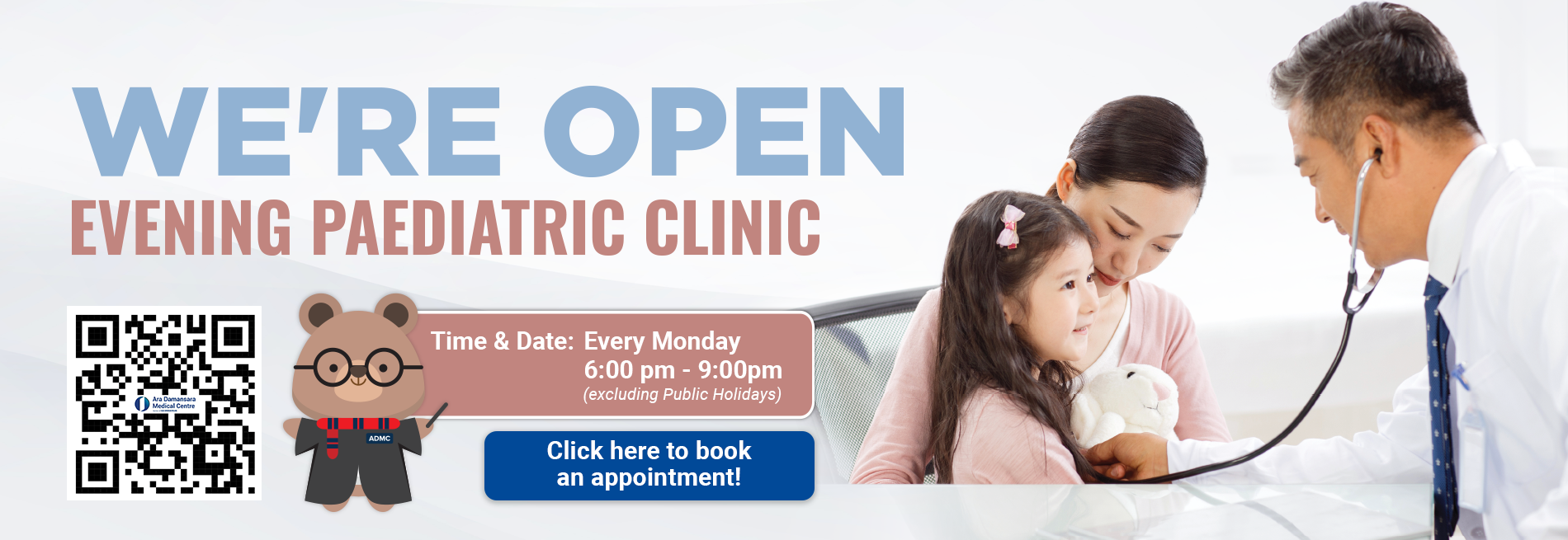 Got questions or need to book an appointment? We're here to help! Chat with us directly on WhatsApp at 019 219 1616.   We're Open: Evening Paediatrics Clinic, Every Monday (excluding Public Holiday), 6:00–9:00 PM | Book Now → +603 7839 9801