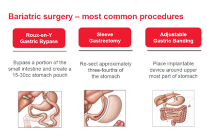 - Gastric Bypass – Reduces the size of your stomach and small intestine, so that you feel fuller with less food and not absorb all the calories from the consumed food.